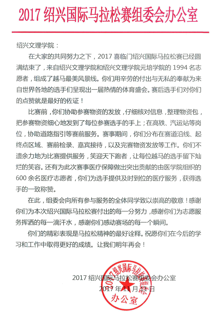 近日,我校收到来自2017绍兴国际马拉松赛组委会的感谢信。信中对我校1994名志愿者在2017绍兴国际马拉松赛中付出的努力表示了由衷的感谢。信中写到:“你们用辛劳的付出与无私的奉献为来自世界各地的选手们呈现出一届热情的体育盛会。赛后选手们对你们的点赞就是最好的佐证!”