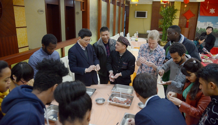 2月15日,农历除夕中午,河西餐厅对竹楼内欢声笑语,校长王建力与在校过年的20余名中外学生欢聚一堂,同吃“年夜饭”,一起迎接戊戌新年的到来。党办校办、学工部、外事处、后勤管理处等部门负责人陪同参与。 王建力与留校学生共包团圆饺、共进团圆餐,并向他们致以诚挚的问候和新春的祝福。他希望同学们同样能在学校度过一个温暖而欢乐的春节,并在新的一年里再接再厉,争创佳绩。 同学们纷纷表示十分感谢学校领导的关心和慰问,要以文理为家过好新年,并继续以学业为重,在新的学期里取得更大的进步。
