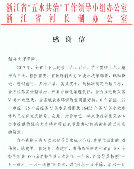 近日,浙江省五水共治工作领导小组(河长制)办公室向我校致感谢信,感谢我校派出的潘伟槐、陈建军、鲁越青、寿建昕、曹伟杰等督导员下沉一线,联乡驻村,充分发挥了指导员、服务员和宣传员的作用,树立了治水铁军良好的形象,为全省剿劣工作提供第一手资料,推动了“剿劣”工作的开展,得到各级领导和群众的称赞。 据了解,根据上级统一部署,从2017年3月份开始,学校实施校园“剿灭劣Ⅴ类水”系列工程,包括河东河西校区管网测绘工程、内河河道清淤工程、兰亭校区污水井改造等10项工程,“剿劣”工程于6月底基本完成,9月底全部完成。