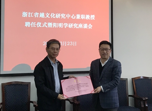3月23日下午,越文化研究院举行兼职教授聘任仪式暨阳明学研究座谈会。校党委书记汪俊昌,副校长华小洋,绍兴本土阳明学专家、天泉山房藏书楼创建人汪柏江出席活动。