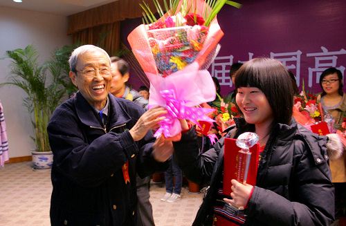 姚穆院士为中国高校纺织品设计大赛获奖者颁奖