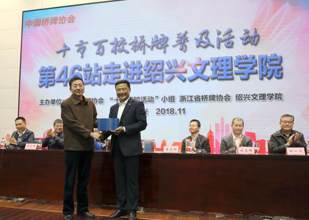 李国华代表中国桥牌协会及十市百校普及推广活动小组向我校赠送了桥牌教具。