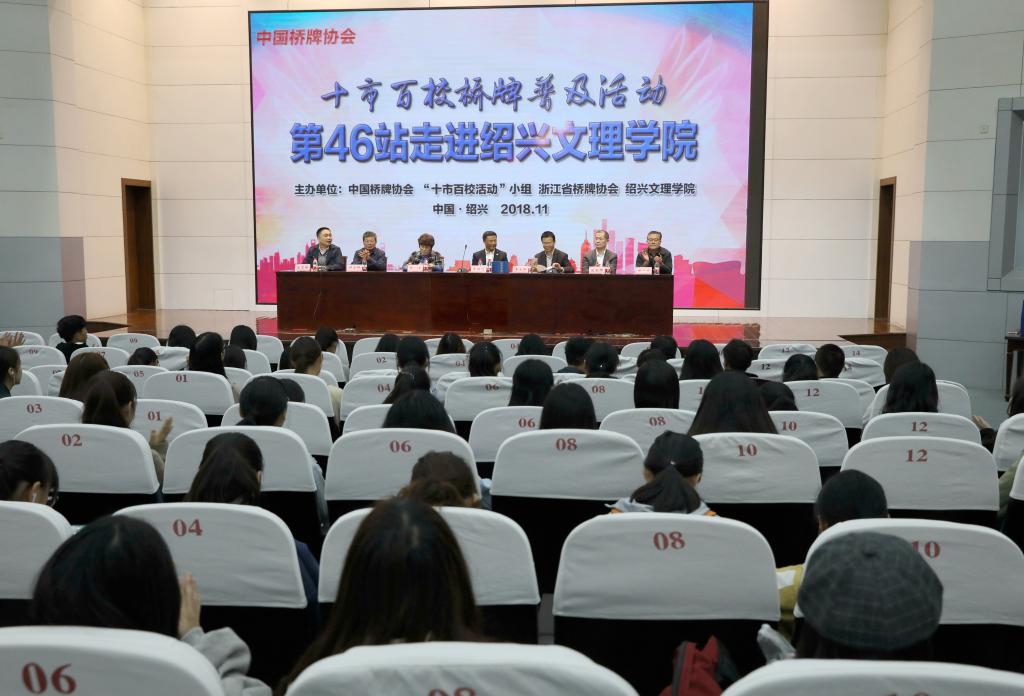 11月13日下午,由中国桥牌协会主办的“十市百校桥牌普及活动”走进我校。副校长寿永明,中国桥牌协会副秘书长李国华,中国桥牌大师仲江,新睿桥牌创始人刘玉璋,绍兴市桥牌协会常务副主席钟宝坤,绍兴市桥牌协会副主席、浙江钱塘桥牌俱乐部主席田一成出席本次活动。