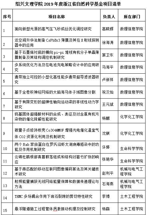 日前,浙江省自然科学基金委员会发文公布了2019年度浙江省自然科学基金项目(浙科金发〔2018〕3号)(http://www.zjnsf.gov.cn/h/01/news_view.aspx?appid=GUD15BBC19BFC6558F1D7017C1046B5D5F9),浙江省科学技术厅 浙江省自然科学基金委员会发文公布了2019年度浙江省公益技术应用研究计划项目(浙科发基〔2018〕183号)(http://www.zjnsf.gov.cn/h/01/news_view.aspx?AppId=GUD9845F4B299976C2BC3D300D9734D18DF),我校共获准主持29项,其中数理信息学院7项、化学化工学院5项、生命科学学院5项、机械与电气工程学院4项、土木工程学院3项、元培学院3项、纺织服装学院1项、医学院1项。其中由土木工程学院李博老师主持申报的项目《THMC多场耦合作用下岩石裂隙的剪切特性研究》获批为2019年度浙江省自然科学基金杰青项目,这是我校首次获得省自然科学基金杰青项目。具体项目见清单。