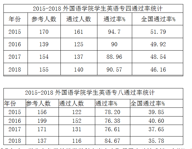 专业考试、学科竞赛成绩斐然。学院的各项教学改革举措对各专业的教学质量的提高起到了极大的促进作用,学生在英语专业四、八级考试中成绩斐然。