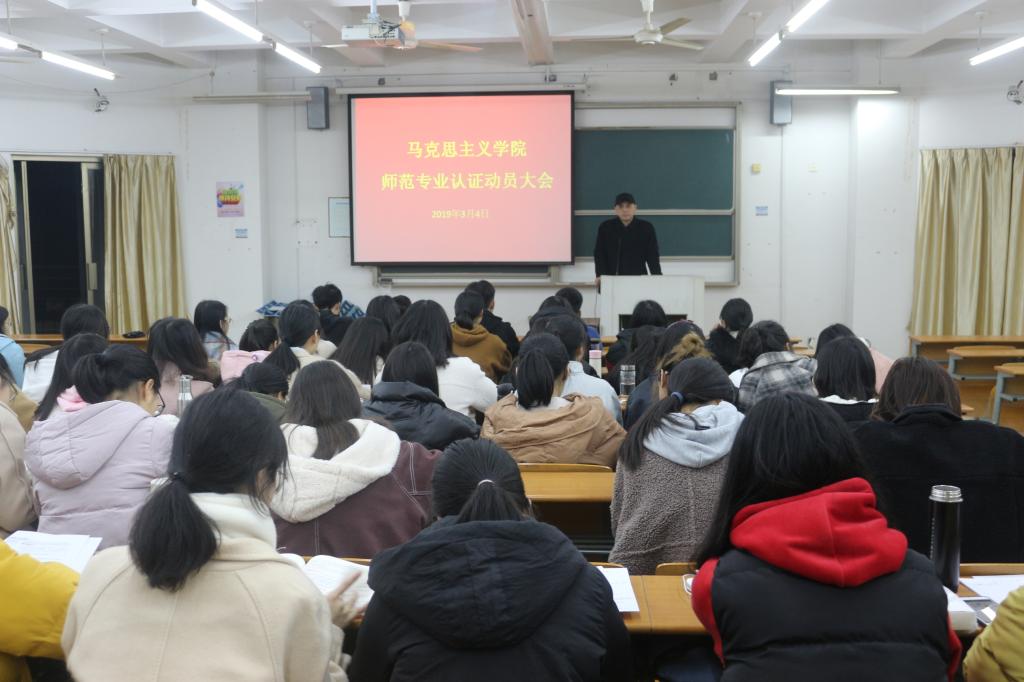 师范专业认证与教师个人发展息息相关,需要每位教师以研究的精神、高度的责任心使命感,吃透认证标准和指标体系,投入认证工作中。本学期伊始,马克思主义学院召开师范专业认证启动大会和专业认证学生动员大会,教师教育学院召开学前教育专业认证工作会议。会议逐项分析专业认证标准,系统全面梳理迎检专业,为专业认证工作的全面开展打下基础。