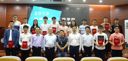 机电学院院长沈士根致词。学工部部长宋浩成宣读表彰决定。主席台领导和嘉宾为陈山军等19名获得第一届“尚典奖学金”的学生颁发证书。