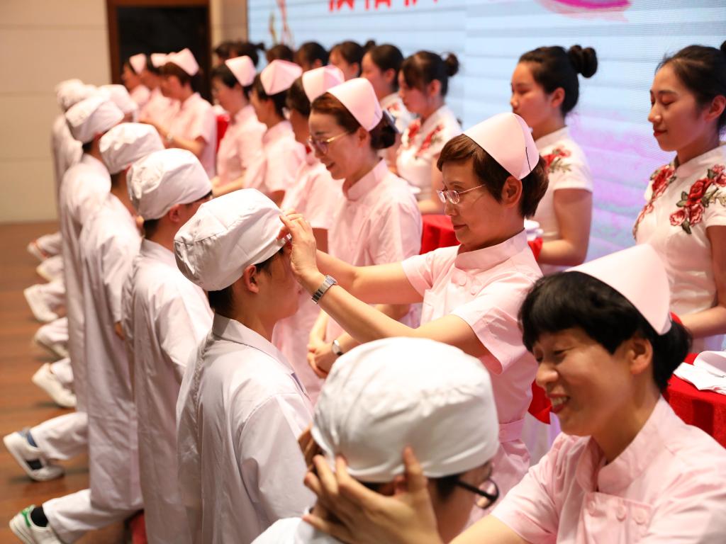 姜小鹰为李晖、谢小燕两位护理专业老师点燃了象征着南丁格尔精神的红烛,并依次传灯,点亮了现场所有护生手中的蜡烛。护理前辈们为188位护生戴上圣洁的燕尾帽。在护理学临床教师、优秀校友代表丁红英老师的领誓下,188位护生举起右手,庄严宣誓。