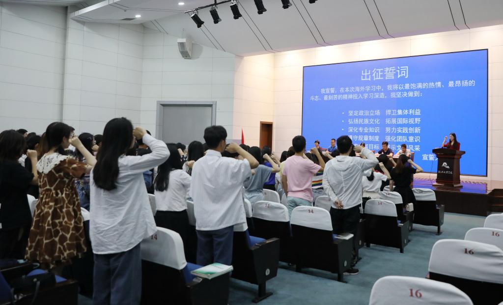 出征仪式上,张宏为交流团授团旗。宣传部副部长金一鸣就安全教育等作详细说明。外国语学院罗军平、商学院戴倩茹分别作为教师代表、学生代表发言。带队老师和全体同学进行宣誓。