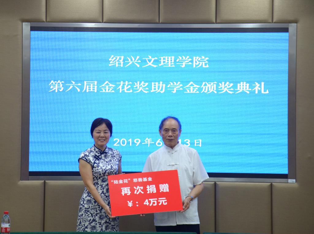 6月13日下午,我校第六届“金花奖助学金”颁奖典礼在铁城科教馆会议室举行。校党委副书记郝敬习出席颁奖典礼,学工部、对外联络处、部分学院负责人和获得第六届“金花奖助学金”的学生代表参加颁奖典礼。绍兴远大轻纺原料有限公司总经理李马鑫先生在毕业生离校前专程赶到学校,为第六届“金花奖助学金”获得者颁奖,并再次向陆金花慈善基金注入4万元,目前捐赠总额已达126万。