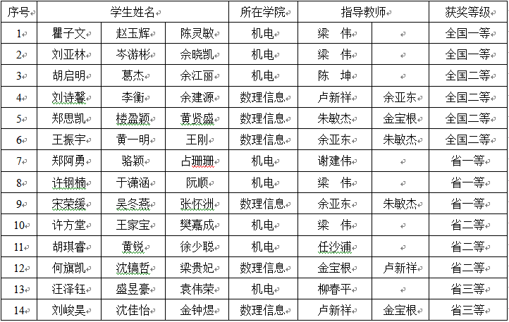 9月1日,由教育部高等教育司与工业和信息化部人事教育司联合主办的“2019年全国大学生电子设计竞赛”在同济大学落下帷幕。我校有14组共42名同学参赛,获奖率100%(全国获奖率48%)。其中获得全国一等奖2组、全国二等奖4组,省一等奖3组、省二等奖3组、省三等奖2组。在所获奖项中,国家级获奖等级与总组数位居全省第2名。