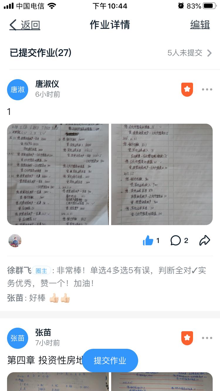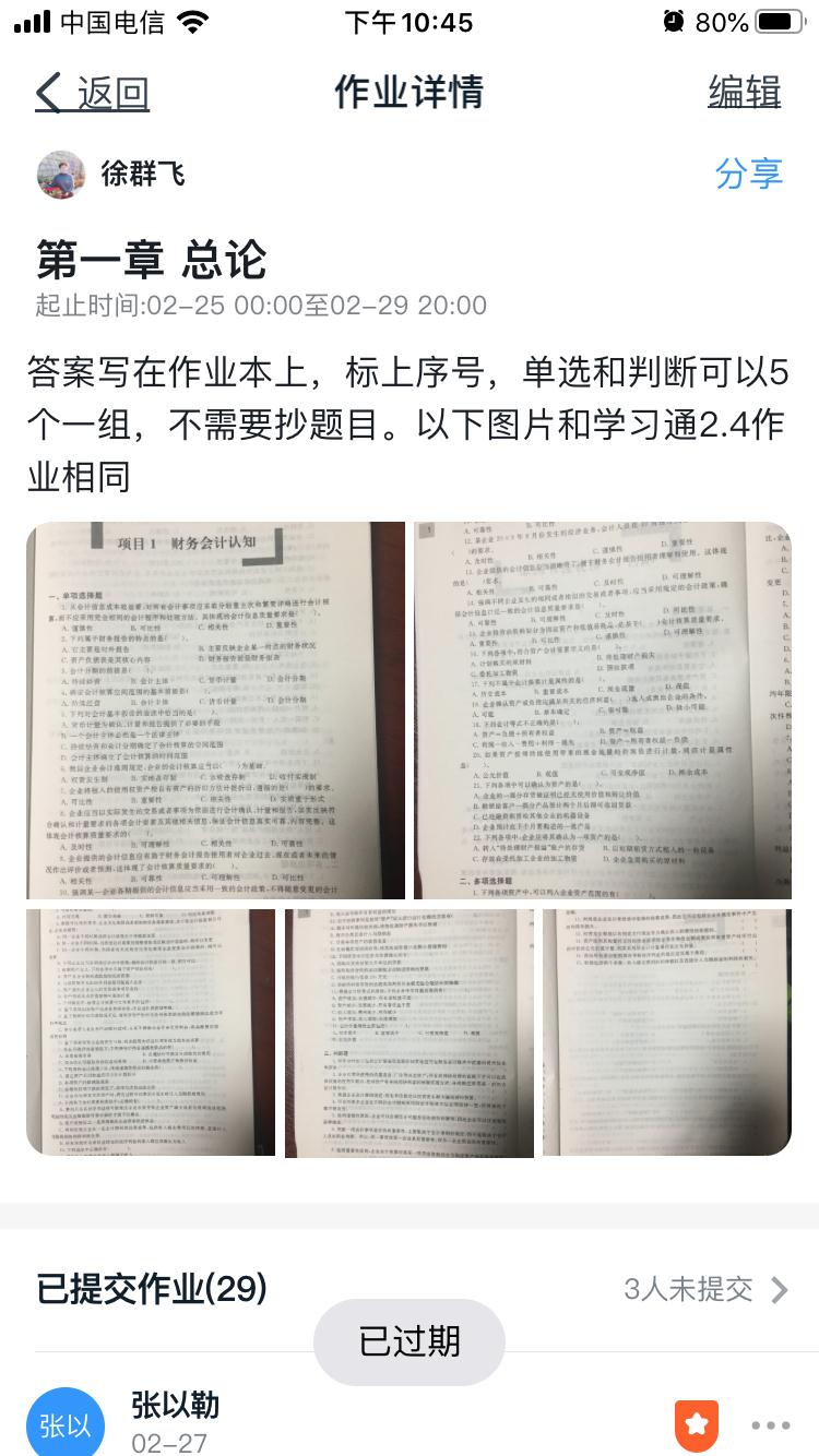 在学习通平台里有相应的测验和作业,教师可以通过学习通去检查学生线上学习和作业的完成情况,客观题还能自动批改,减轻了教师的批改压力;也可以通过钉钉“作业”的功能发放作业,学生在平台提交作业,教师批阅。学生的作业可以做在作业本上,然后拍图片上传。