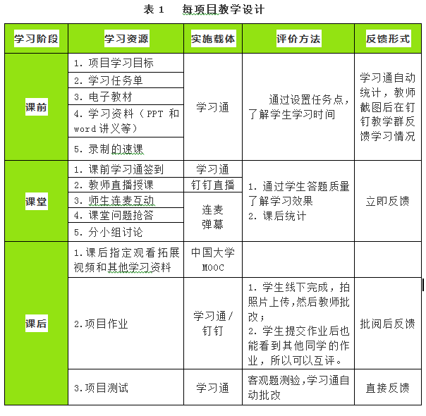 根据对学生的了解以及课程的性质,为保证学生学习成效,最终选择学习通资料分享+钉钉直播的混合式教学模式。本课程分为七个项目,每项目教学总体设计如表1所示。