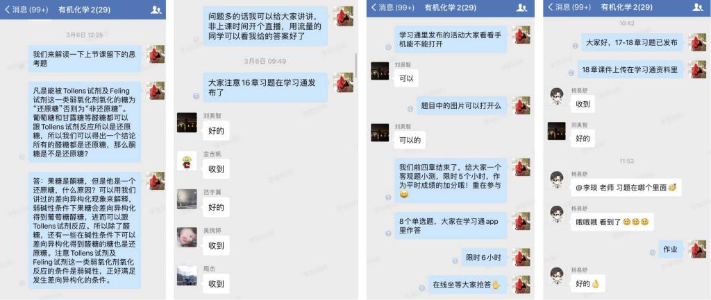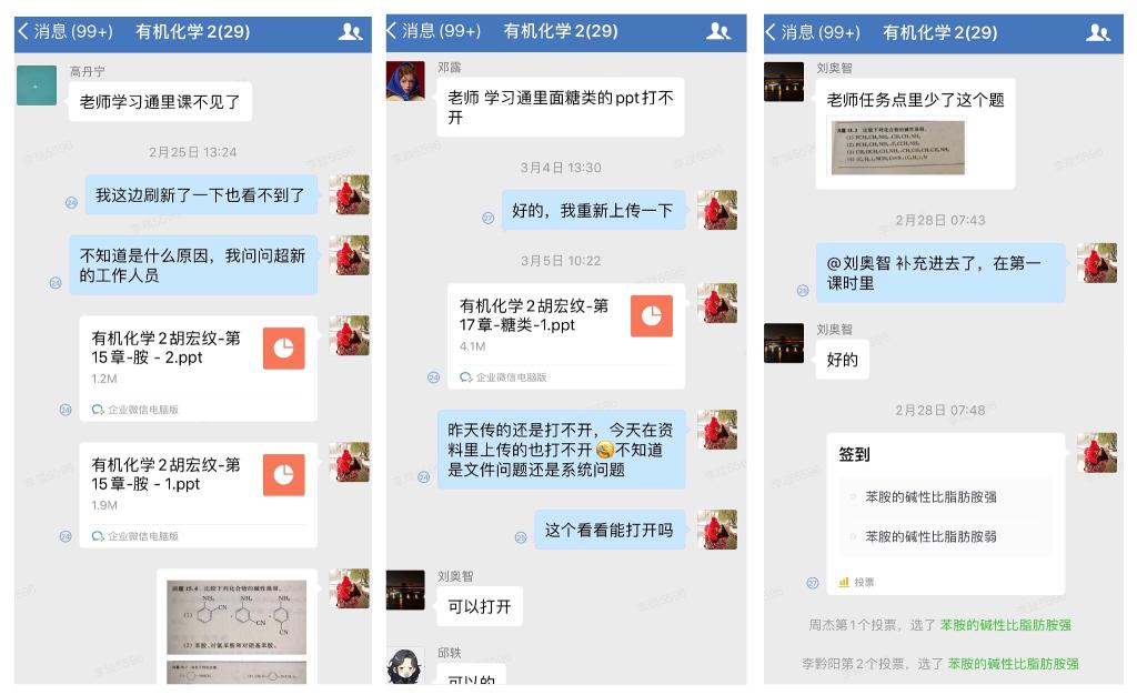 每次课后,教师通过超新星学习通平台发布相应的学习任务和单元作业,通过软件自带统计功能检查学生线上学习和作业的完成情况(见图7-8),并通过企业微信督促学生,对学生学习中的问题进行指导答疑(见图9)。学习通上的作业批改模式比较多样化,一些客观题为主的作业比如选择题可以上传答案后由系统自动批改,可以选择生生互改或教师批改。由于有机化学课程中更多习题是需要学生画出反应式或化合物结构式,纯文本输入方式并不合适,所以我要求学生作业完成后拍照上传,再由老师来批阅并将结果反馈给学生(见图10)。
