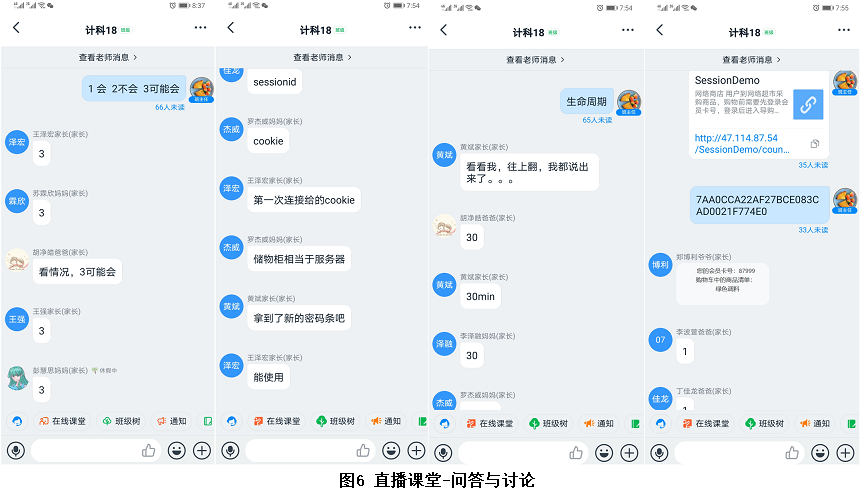 课前10分钟,开始钉钉直播,播放音乐,开启课前签到。上课时间到,先试音,确保学生听清楚后再按照预先打印好的直播备课单开始直播。本课程主要在Web开发工具中进行操作演示和代码分析。直播过程中的提问和讨论采用钉钉直播群里文字形式,一般简单问题用选择题,让学生发1,2,3,4形式的答案选项,这种形式参与度高,效率高。直播结束,导出学生签到表和直播听课时长表。