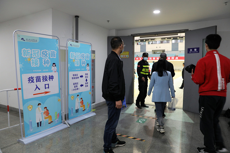 接种当天,前来接种的师生带好口罩,有序排队进入接种场地。