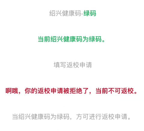 4.学校审核结束以后,若填写有误,可由班主任发回给学生重新填写。若审核未通过健康通行证界面会变成如下界面,在“学生返校登记”中可以查看审核未通过的原因。