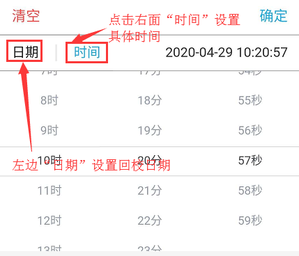 注意:在选择时间控件中,左边“日期”可以选择到校日期,右边“时间”可以设置具体到校(到绍)时间。