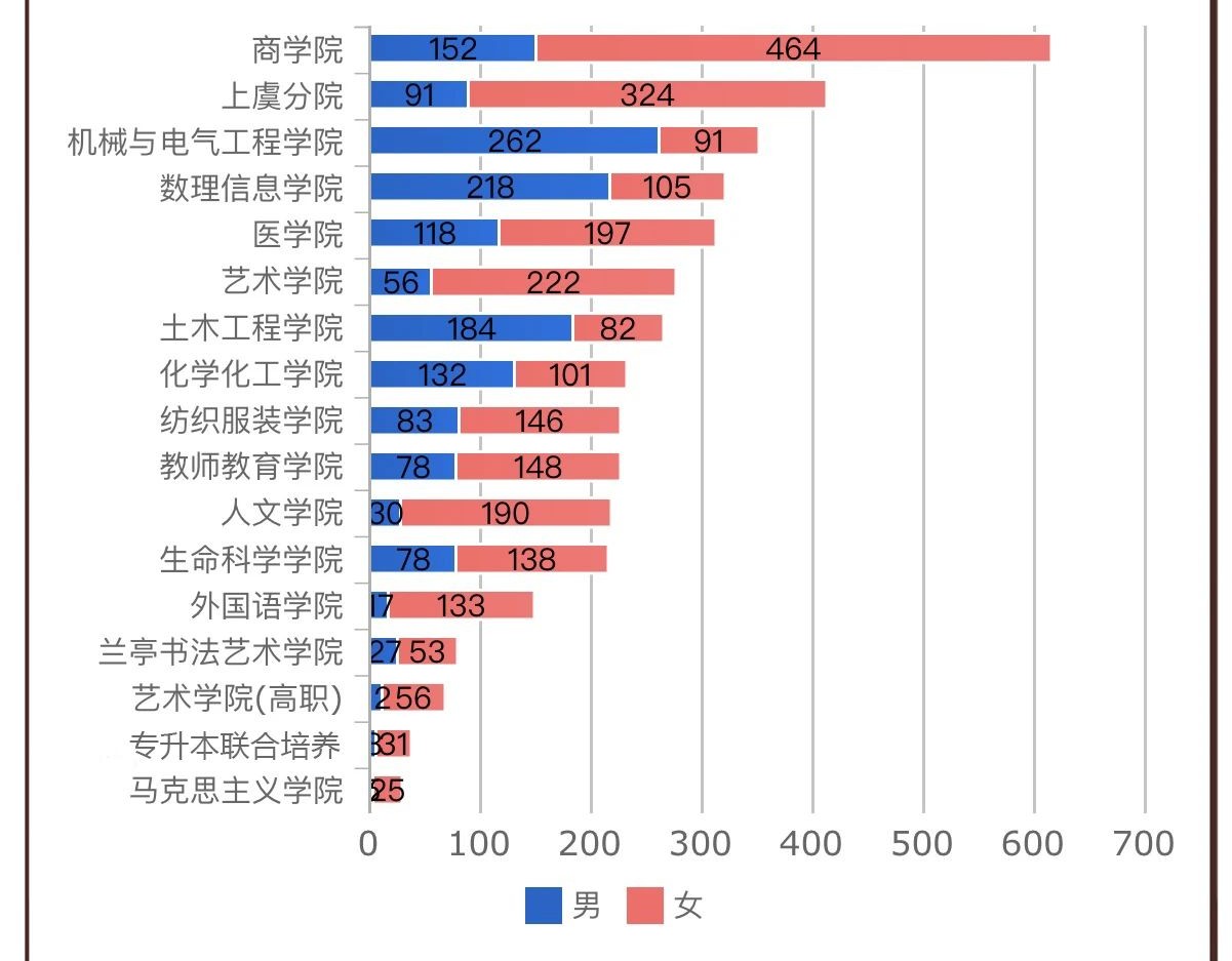 其中,机械与电气工程学院汉子扎堆!而隔壁的商学院、上虞分院、艺术学院,倒是有不少的小仙女呢!