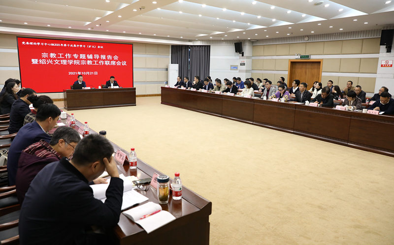 10月21日下午,宗教工作专题辅导会暨宗教工作联席会议在图书馆一楼报告厅举行。会议邀请浙江省民族宗教事务委员会副主任陈振华作专题辅导报告。校领导汪俊昌、王建力、沈赤、张宏、柯羽、黄坚,校党委委员、宣传部部长梁瑜参加会议。市委宣传部(网信办)、市委统战部、市委政法委、市教育局、市公安局、市国家安全局、团市委以及绍兴市各高校相关负责人,学校相关职能部门、各二级党组织书记参加会议。此次会议也是学校党委理论学习中心组扩大会议。