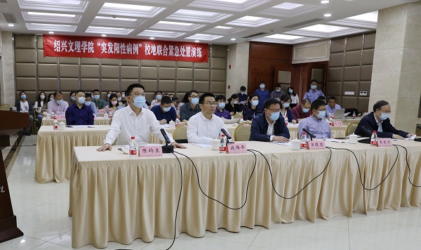 为贯彻落实省、市教育主管部门及属地疫情防控要求,进一步推动疫情防控“七大机制”落实落地,全面提高校地联合应对突发疫情的应急处置能力,4月22日下午,我校在风则江校区举行“突发阳性病例”校地联合紧急处置演练。校党委书记汪俊昌,校长王建力,副校长黄坚、陈均土,越城区人大常委会副主任钱伟平,绍兴市疾控中心病媒生物预防控制科科长蒋国钦,越城区塔山街道党委书记叶海木、副主任章雨晴,越城区疾控中心副主任马锡军,市、区教育局,市、区学校代表以及我校相关职能部门、各二级学院负责人参加演练。