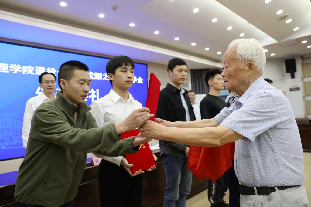 张宏宣读2021年退役士兵“戎耀之星”奖学金表彰决定。任锡纯为退役士兵“戎耀之星”奖学金获得者颁发证书。