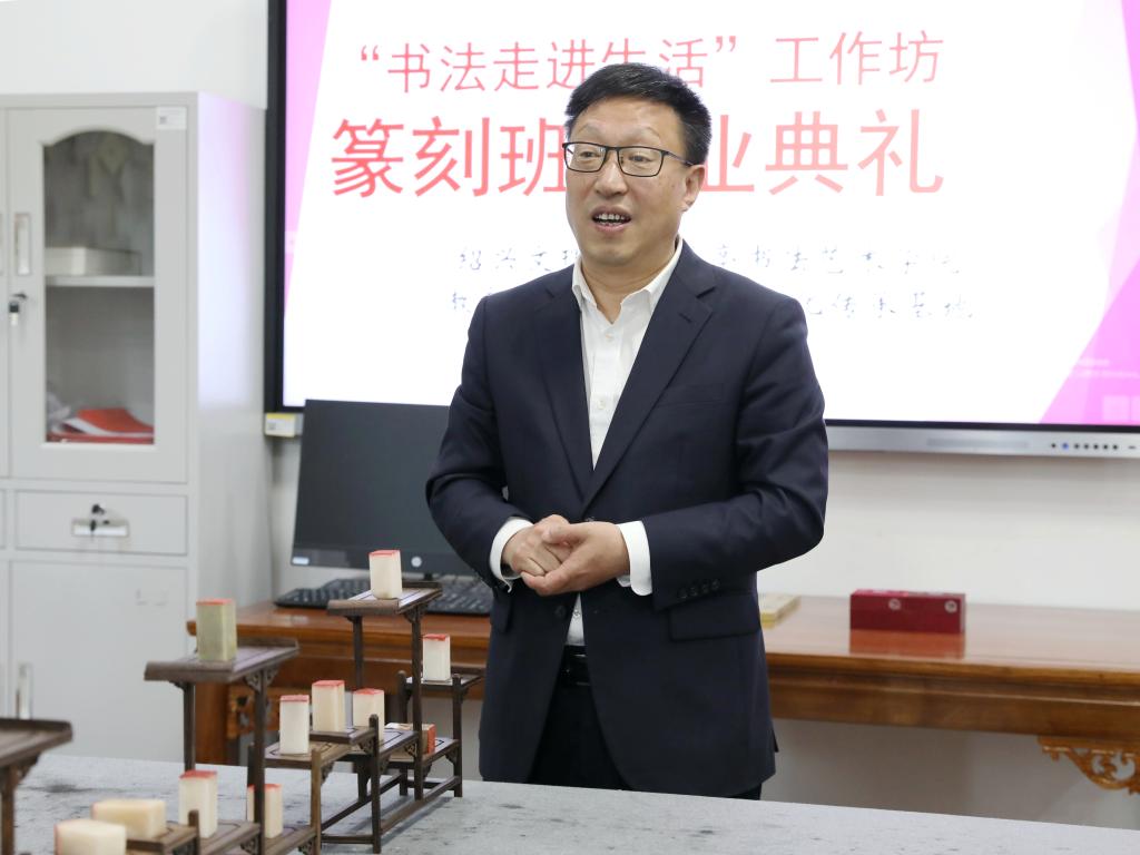 5月17日,中华优秀传统文化传承基地(书法)举办“书法走进生活”篆刻班结业仪式。校党委书记汪俊昌参加仪式并与结业学员亲切交流。兰亭书法艺术学院副院长,基地相关负责人,教师代表、研究生助教等参加活动。