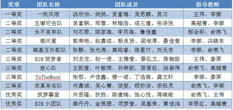 本次大赛在智能建造与管理教学团队老师的指导下,共有11个代表队参赛,获奖名单如下: