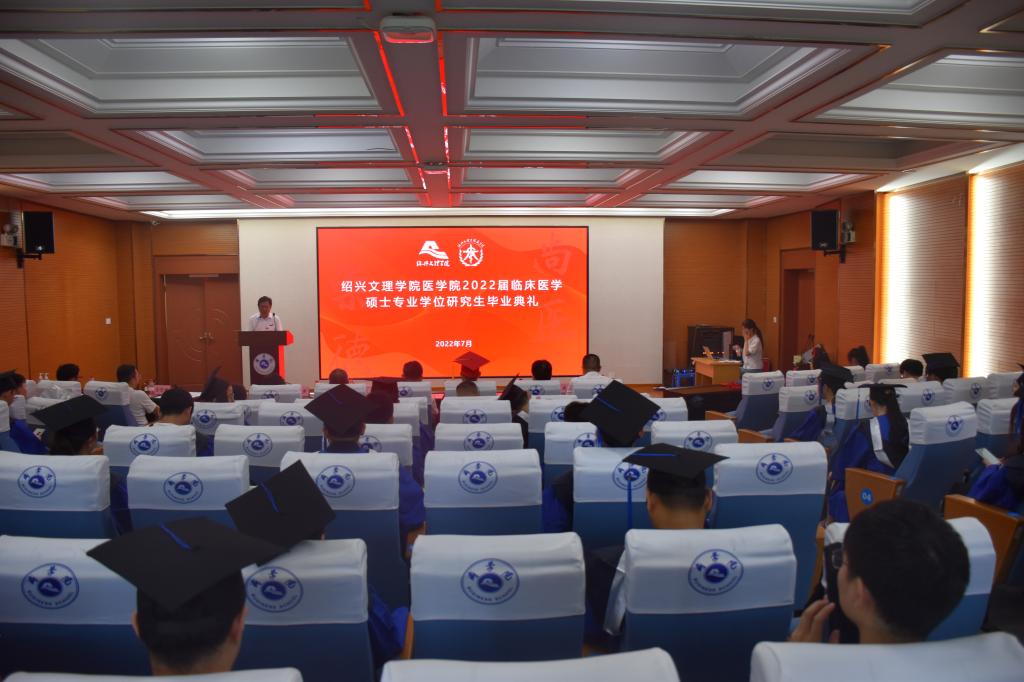研究生处处长令狐文生为获得2022届绍兴市普通高等学校优秀毕业生颁奖,医学院党委副书记金坚强主持典礼,常务副院长葛建荣宣读考博奖学金表彰文件,副院长邢海燕宣读学位授予文件。