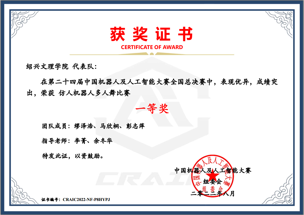 仿人机器人多人舞比赛一等奖(第一名)团队获奖证书