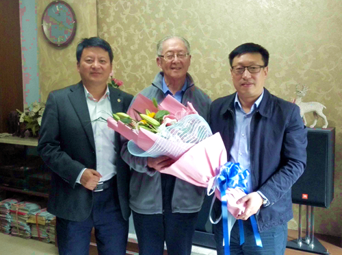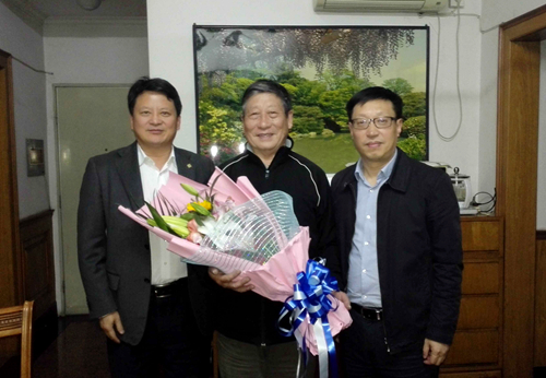 校党委书记汪俊昌与学校老领导孙元钧合影。从左到右依次为沈赤、孙元钧、汪俊昌。