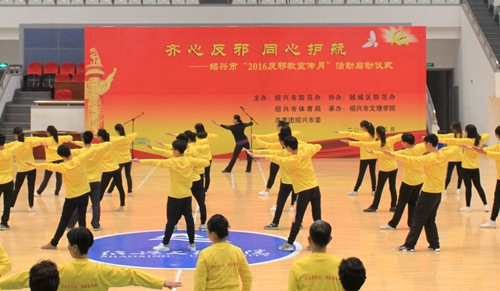 5月13日,绍兴市“2016反邪教宣传月”活动启动仪式在我校河西体育馆举行。绍兴市防范办主任傅永义、绍兴市体育局副局长陈卫民、共青团绍兴市委副书记赵浪平、我校保卫处负责人、大学生反邪教协会志愿者、乡镇街道机关干部志愿者、村(社区)干部志愿者、健身气功站点反邪教志愿者及各社区街道反邪教志愿者参加启动仪式。