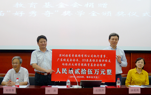 5月30日下午石国洪校友向校教育基金会捐赠暨首届“好秀奇”奖学金颁奖仪式在南山校区7号楼1楼报告厅举行。深圳好秀奇服饰有限公司执行董事、广东校友会会长、英语89届石国洪校友,校党委副书记沈赤,教育基金会理事、校友总会会长宋培基,校友联络办(教育基金会)、外国语学院相关负责人,以及师生代表共260多人出席仪式。
