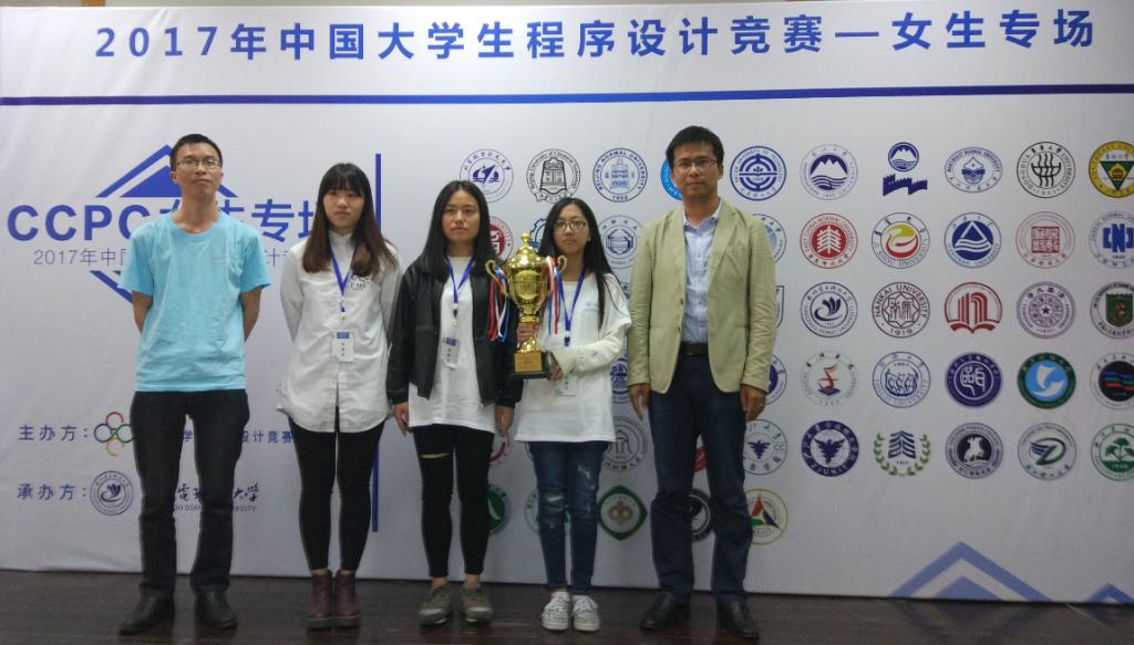 5月6日,在杭州电子科技大学举行的第二届“中国大学生程序设计竞赛—女生专场”中,我校机电学院计算机131班张碧莲、计算机152班谢思思、计算机151班包桉银组成的“不得了“代表队(指导老师:黄龙军)喜获季军,冠、亚军分别由上海交通大学和清华大学代表队获得。