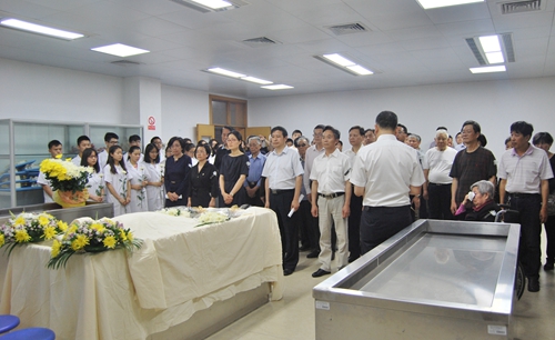 王继岗介绍了王培孔同志的生平事迹;王老的家属代表发表了感言;郑杰向王老的家属代表颁发了遗体捐献证书,全体人员手持菊花深深地三鞠躬,整个仪式简朴而庄重,实现了王老生前嘱咐过的愿望。