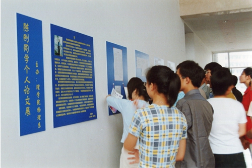 学院实施个性化培养,激发学生的科研兴趣和创造力,使学生走上科研之路。图为学院2001年为在校本科生陈刚成功举办个人论文展。
