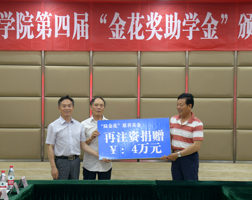 6月1日下午,我校第四届“金花奖助学金”颁奖典礼在铁城科教馆一楼会议室举行。李马鑫先生与其弟弟李兴友先生专程赶到学校,亲自为第四届金花奖助学金获得者颁奖,并再次向陆金花慈善基金注入4万元,目前基金总数已达117万。校党委书记汪俊昌、党委副书记唐和祥出席颁奖典礼。