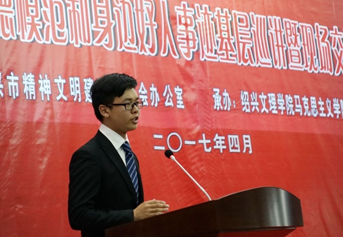 “让我们每一个人都都成为宣讲员,一传十,十传百的把道德模范事迹分享出去,让更多人的心灵为之震撼……”4月7日下午,由绍兴市文明办主办,我校马克思主义学院、法学院承办的“道德的力量”绍兴市道德模范和身边好人先进事迹首场基层巡讲暨现场交流活动在南山校区7号楼报告厅举行。第四届绍兴市道德模范范立刚、周贤人和第三届绍兴市道德模范潘旗龙参与现场交流。绍兴市委宣传部部务会议成员、市文明办副主任徐人杰,市文明办未成年人思想道德建设工作处处长车东海,我校马克思主义学院、法学院负责人,马克思主义学院、法学院师生代表参加活动。