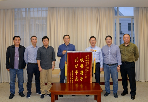 10月14日下午,越城区委常委、公安分局局长朱永潮,越城区公安分局党委副书记、政委戴达康率公安分局相关部门负责人专程来校赠送锦旗,对我校G20杭州峰会期间维稳安保工作及警校志愿者进驻的安保服务工作表示感谢和慰问。校党委副书记唐和祥代表学校接受锦旗。