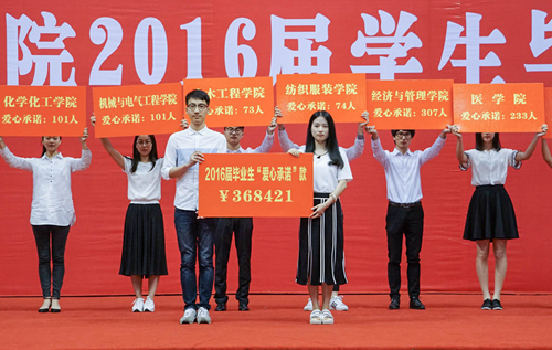 作为毕业生离开母校时爱校教育的一项传统活动,“爱心承诺”凝聚着毕业生们对母校和学弟学妹的深情厚谊。2016届毕业生中有2031人作出了“爱心承诺”,承诺总金额达到368421元。在校生代表代表学校受赠。