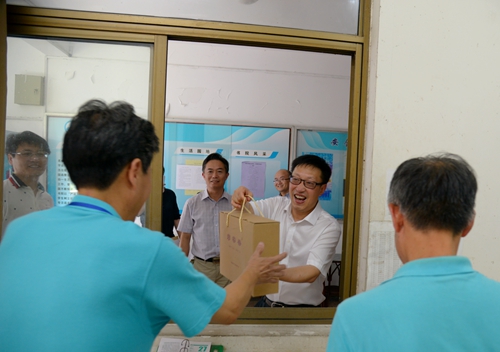 汪俊昌一行先后走访了河西餐厅、河西医务室、基建处、河西门卫、南山门卫、建功书院、招生办公室,亲切慰问暑假期间依然坚守岗位的后勤、基建、保卫和医疗工作者等。每到一处,都与在岗教职员工一一握手并亲切交流,了解教职工们的工作情况,向他们表示亲切的慰问,并送上防暑用品。