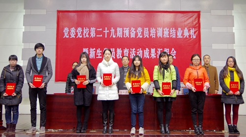 随着雄壮的《国际歌》歌声响起,结业典礼拉开帷幕,本期预备党员培训班历时两个多月,开展了专题讲座、志愿服务、社会实践等培训内容,经过考试考核,共有253名学员顺利结业,17名学员被评为优秀学员。在结业典礼上,党校办主任杜坤林宣读了结业文件,与会领导为优秀学员及结业学员代表颁发了证书。