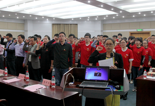 在庄严的《国际歌》中,与会领导为新生党员代表佩戴党员徽章并赠送了《习近平总书记系列重要讲话读本》、《世界大格局,中国有态度》和《苦难辉煌》等3本学习书籍。随后,全场所有党员面向党旗,高举右拳,进行了宣誓,重温入党誓词。来自土木工程学院的2015级硕士研究生赵灿同学和来自法学院思政121班的陈佳颖同学分别作为新、老生党员代表上台发言,陈佳颖结合大学成长经历,谈了自己对共产党员身份的理解和感悟,道出了共产党员应有的责任和担当;赵灿同学则从适应崭新大学和研究生生涯角度出发,在党旗下作出了投身党的事业的决心、勇气和承诺。
