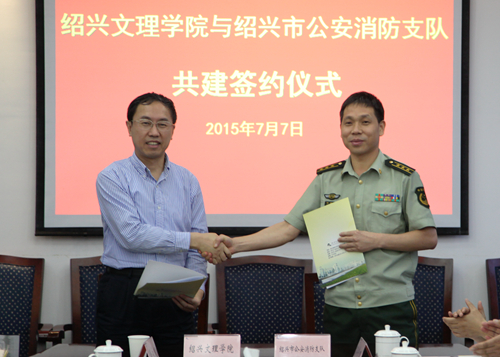 7月7日正值“卢沟桥事变”抗战爆发78周年纪念日,我校与绍兴市公安消防支队达成全面战略合作协议,实现军民结姻亲、再叙鱼水情的新篇章。当日下午,签约仪式于我校行政楼四楼会议室举行。绍兴市消防支队政委戴慧峰与支队长傅松良率副支队长、纪委书记、参谋长等部队相关领导,我校党委书记周达军与校长叶飞帆带领学校全体党政领导班子共同出席签约式。校党委副书记唐和祥主持仪式。