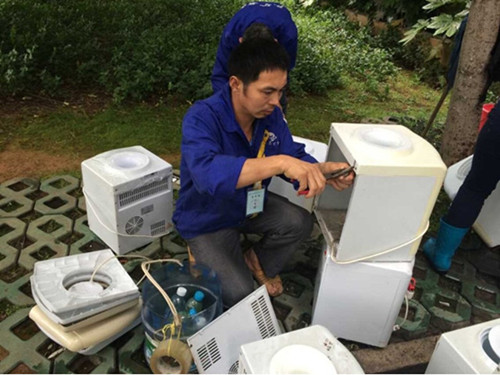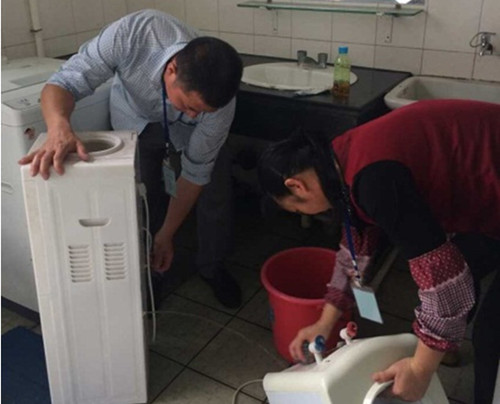 清洗现场,工作人员拆开机器,擦洗饮水机内胆和盖子的内外侧,用清水连续冲洗饮水机整个腔体,最后打开所有开关排净污水,并且对有损坏的饮水机进行了修理。