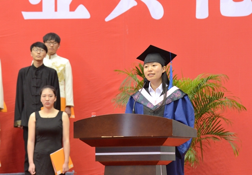 本科毕业生代表,教育学院学前教育111班鲁飞同学发言。她在回顾4年大学生活的收获和精彩后提出了3点建议和大家分享:关于工作与奋斗,要摆正自己的位置,存大志,做小事,先就业后择业,再创业;关于生活与心态,未来要努力工作,但也要认真生活;关于处世与梦想,要在自己岗位上坚持正知正见。