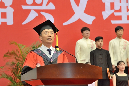叶飞帆校长致辞。“从小到大,你们经历过无数的毕业典礼,今后也将会有。但今天是你们人生中最荣耀的一次毕业典礼。这里是你们迈向社会的第一个台阶!”叶飞帆校长向所有2015届本科毕业生和硕士研究生表示了由衷的祝贺!他以感恩、责任和祝福三个关键词寄语毕业生们。要感恩父母,是他们在你们的人生成长路上殚精竭虑、牵肠挂肚;要感恩教职员工,他们在各自的岗位上教育育人、管理育人、服务育人,教导你们做人、做事、做学问,指引你们前行的道路;要感恩同学,是那份如手足般的关心、帮助和友爱让你们的大学生活更加精彩;同时也要感恩社会各界人士,感谢他们对学校发展的支持,以设立奖助学金、提供就业、实习岗位等多种方式关注文理学子的成长成才。