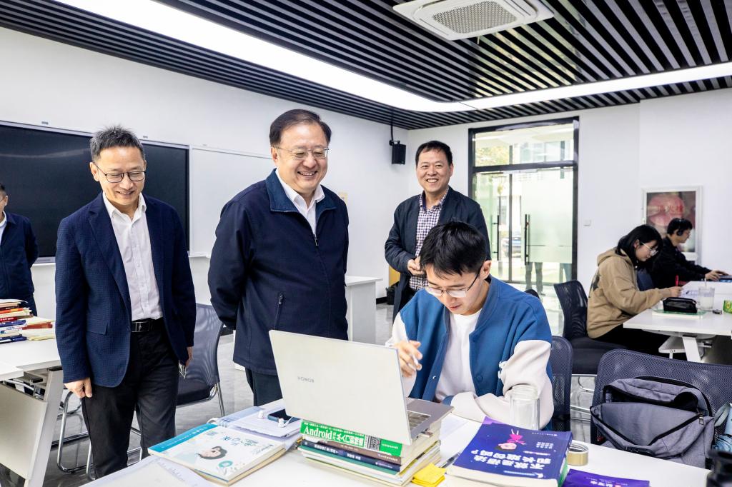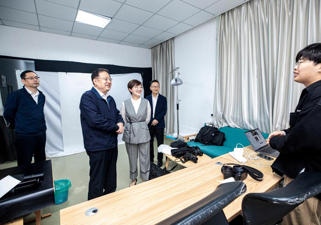 王涛一行实地走访检查了创新创业学院、服装智能制造实验室和VR虚拟仿真实验室、腾讯云互联网学院和哈工海渡机器人学院,深入教学楼、实验室等场所,认真了解有关工作和学生学业情况,详细听取相关负责人工作汇报,同现场师生进行亲切交流。