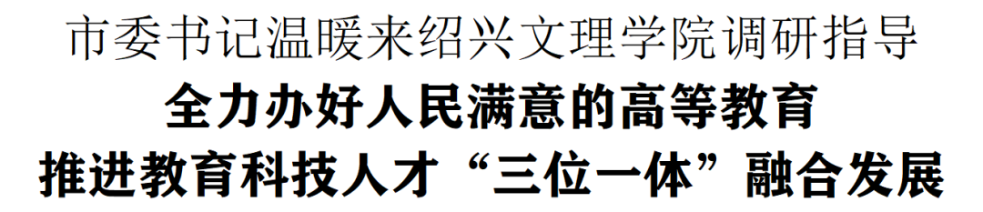 5月23日下午,绍兴市委书记温暖来校调研指导。他强调,深入学习贯彻习近平总书记关于高等教育的重要论述精神,全力办好人民满意的高等教育,加快推进教育科技人才“三位一体”融合发展,为勇闯中国式现代化市域实践新路子提供强大支撑。市委常委、副市长王涛,校党委书记汪俊昌、校长赵阳、党委副书记沈赤陪同。