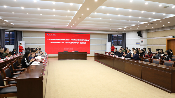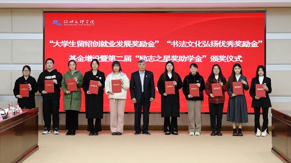 毛宇峰介绍了“大学生留绍创就业发展奖励金”“书法文化弘扬优秀奖励金”“励志之星奖助学金”的基本情况。地方服务与合作处副处长(主持工作)、教育基金会理事长夏婷主持仪式。商学院工商管理201班王暑玲作为获奖学生代表发言。